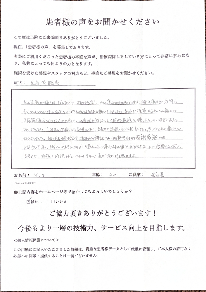 1回目の治療から効果があり、続けて毎週1~2回受けると歩いたときの痛みがなくなりました。(足底筋膜炎 Y.I様 60代 会社員)