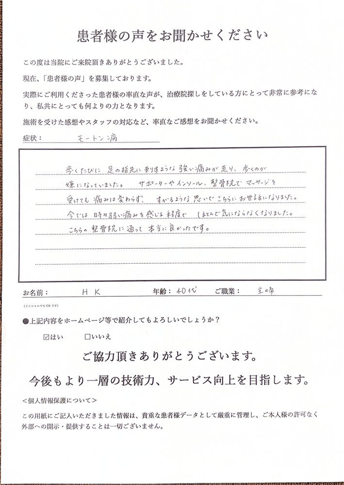 もう大丈夫です!当院には、モートン病でお悩みの方に多数ご来院頂き、改善されているケースが数多くあります。