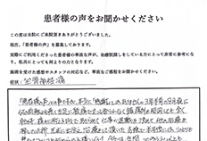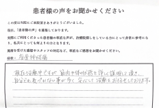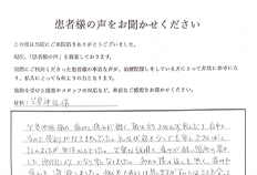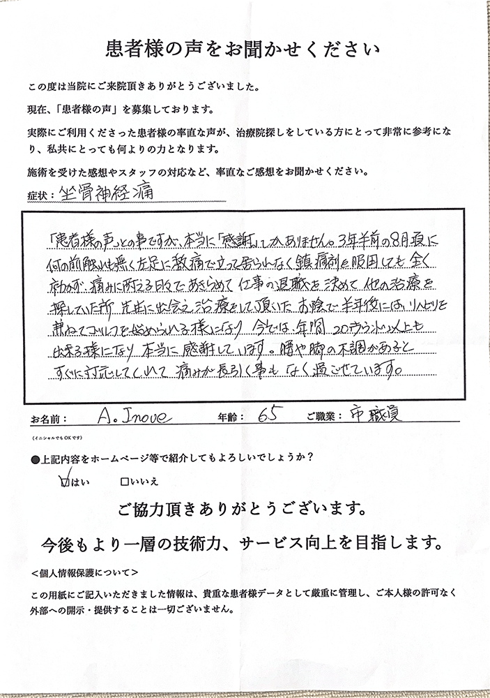 治療をして頂いたお陰で半年後にはリハビリを兼ねてゴルフを始められる様になり、今では年間20ラウンド以上も出来る様になり本当に感謝しています。(坐骨神経痛 A.Inoue様 65歳 市職員)