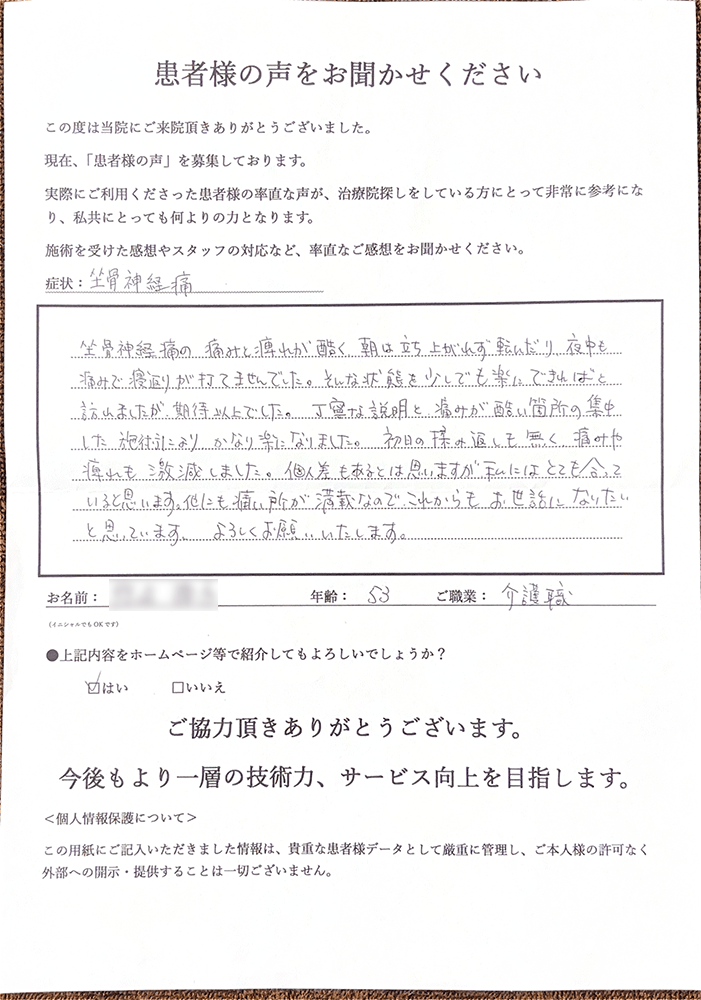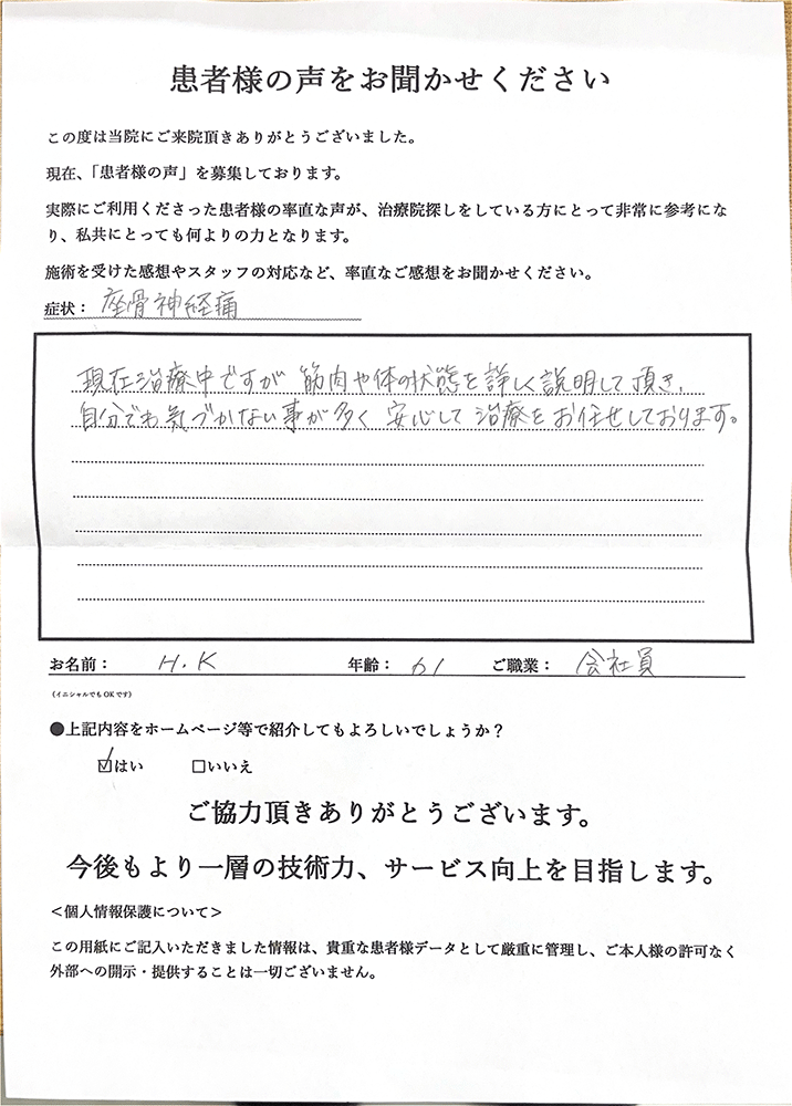 もう大丈夫です!当院には、坐骨神経痛でお悩みの方に多数ご来院頂き、改善されているケースが数多くあります。